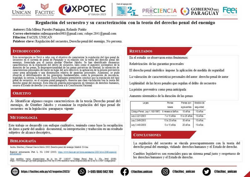 Esta investigación se llevó a cabo con el objetivo de caracterizar la regulación del tipo penal de secuestro en el sistema de penal de Paraguay y su relación con la teoría del derecho penal del enemigo, formulada por el jurista alemán Günther Jakobs. Se han identificado elementos característicos en la regulación del delito de secuestro, tales como el aumento sistemático de la duración de las penas, la desproporcionalidad de las penas privativas de libertad, la valoración de características personales del autor en lugar del acto delictivo, la aplicación de la prisión preventiva como pena anticipada y una disminución relativa de garantías procesales. Asimismo, se pudo observar el debilitamiento de los principios fundamentales, como la presunción de inocencia, legalidad, la certeza, la humanidad. Estos hallazgos permitieron concluir que la regulación del tipo penal de secuestro, en el sistema penal paraguayo, muestra una clara vinculación con la teoría del derecho penal del enemigo. Esta relación plantea preocupación en términos de derechos humanos, socava el Estado de derecho y es contradictoria a la Constitución Nacional. El objetivo del trabajo es identificar algunos rasgos característicos de la teoría Derecho penal del enemigo, de Günther Jakobs y examinar la regulación del tipo penal de secuestro en la legislación paraguaya vigente.