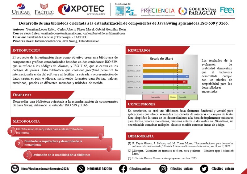 El proyecto de investigación tiene como objetivo crear una biblioteca de componentes gráficos estandarizados basados en dos estándares: ISO 639, que se refiere a los códigos de idiomas, y ISO 3166, que se centra en los códigos de países. Esta biblioteca que contiene jtextfield permitirá la internacionalización del software al facilitar la entrada y representación de datos según el país e idioma, incluyendo formatos para fechas, valores numéricos, precios en diferentes monedas y unidades de medida. El objetivo del trabajo es desarrollar una biblioteca orientada a la estandarización de componentes de Java Swing utilizando el estándar ISO 639 y 3166.