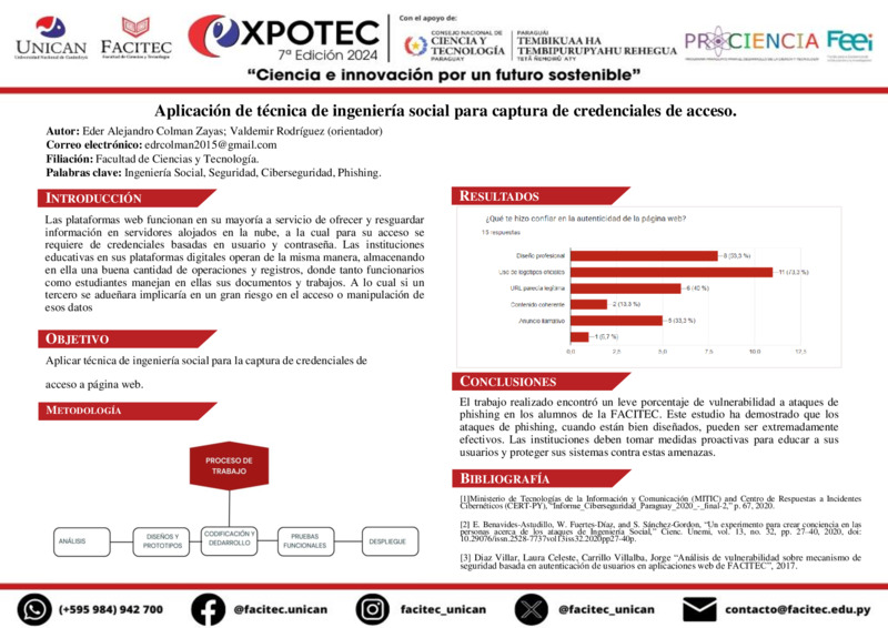 Las plataformas web funcionan en su mayoría a servicio de ofrecer y resguardar información en servidores alojados en la nube, a la cual para su acceso se requiere de credenciales basadas en usuario y contraseña. Las instituciones educativas en sus plataformas digitales operan de la misma manera, almacenando en ella una buena cantidad de operaciones y registros, donde tanto funcionarios como estudiantes manejan en ellas sus documentos y trabajos. A lo cual si un tercero se adueñara implicaría en un gran riesgo en el acceso o manipulación de esos datos. El objetivo de este trabajo es aplicar técnica de ingeniería social para la captura de credenciales de acceso a página web.