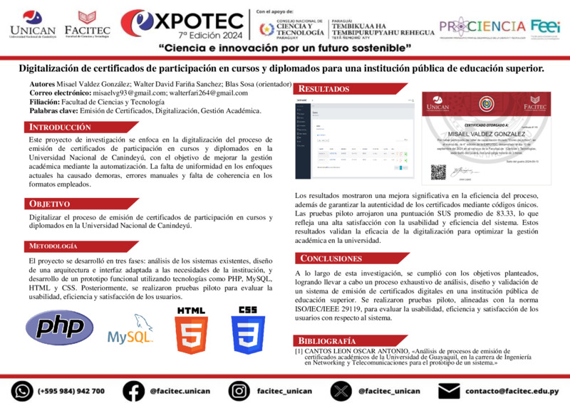 Introducción: Este proyecto de investigación se enfoca en la digitalización del proceso de emisión de certificados de participación en cursos y diplomados en la Universidad Nacional de Canindeyú, con el objetivo de mejorar la gestión académica mediante la automatización. La falta de uniformidad en los enfoques actuales ha causado demoras, errores manuales y falta de coherencia en los formatos empleados. Objetivo: Digitalizar el proceso de emisión de certificados de participación en cursos y diplomados en la Universidad Nacional de Canindeyú.